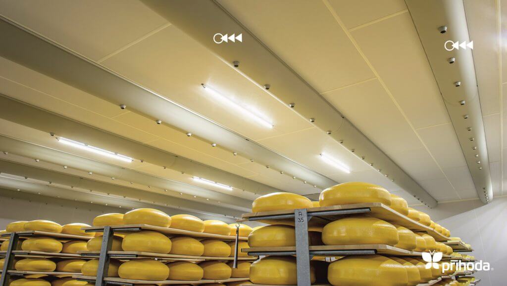 在大型冷库中,普利荷达织物风管分配系统提供均匀的空气分配,确保产品温度和温度区域的稳定.在有很多人工作的低温的生产区,高气流速度将会成为身体不适的主要原因,并可能导致更高的感冒或缺勤率。织物风管和散流器在低风速的情况下分散冷空气,为工人创造舒适低速的工作环境.]